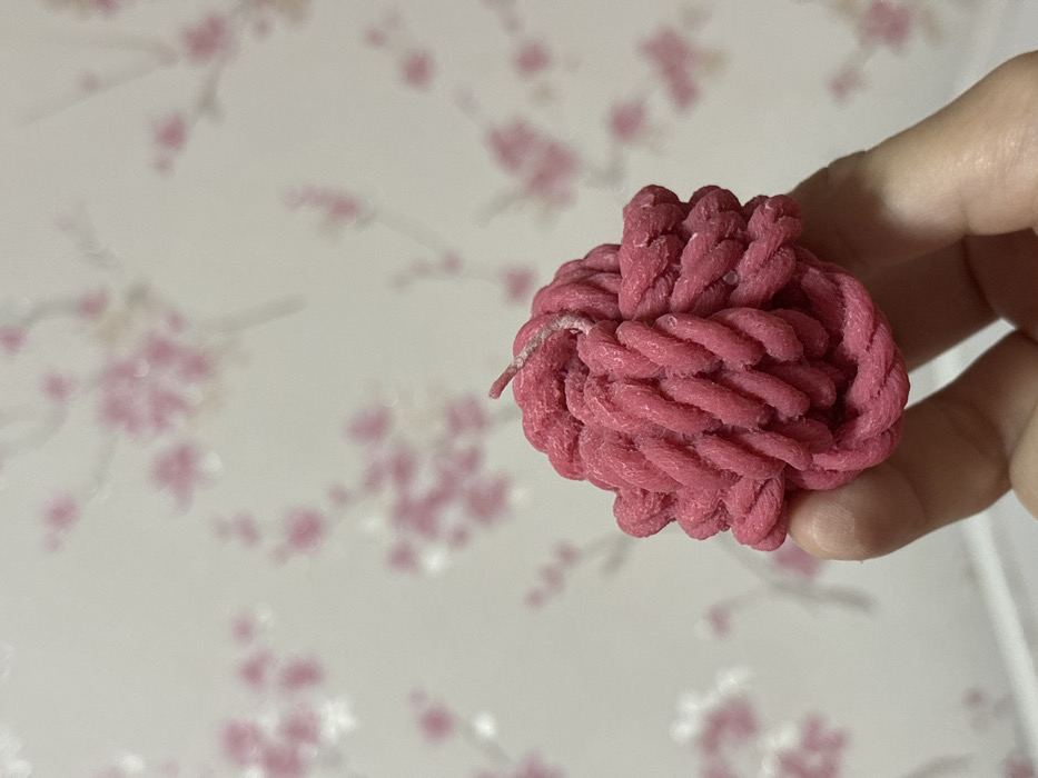 A pink, spherical object resembling a flower made of tightly wound cord is held between someone's fingers