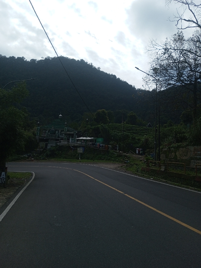 The image depicts an overcast daytime scene of a curved asphalt road leading into a rural, mountainous area in Thanthirimale, Sri Lanka. In the foreground, a dark gray road with a solid white line on its left edge and a solid yellow center line curves left and then straightens, disappearing into the middle ground. No vehicles or pedestrians are visible. On the left side of the road, set back on an elevated plot, stands a multi-domed building with a green roof, appearing to be a mosque, with text partially visible on its facade (likely "MASJID"). Adjacent to this structure are additional smaller buildings or stalls, some featuring blue tarpaulin coverings and what appear to be clothes hanging to dry. A white informational signpost is positioned near the road in front of these structures. Further left, a partial white sign with visible letters "LA" and "AR" is present. Overhead utility cables diagonally traverse the upper left sky. The environment is characterized by dense green foliage, with a heavily forested mountain rising prominently in the background, obscuring the horizon. The sky is predominantly cloudy. On the right side of the road, a street light pole with a luminaire extends upwards, partially obscured by trees. Further right, a low concrete wall topped with yellow metal railings parallels the road. Beyond the road on the right, additional trees and dense vegetation are visible, with some small, colorful objects (red and blue) on the ground near the base of the hill.