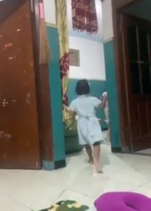 A video shows two young girls running across a tiled floor indoors. One girl wears a light blue dress, and the other wears a light pink outfit. There are doorways and wall decorations in the background, along with cushions and a patterned mat on the floor. The overall lighting is slightly dim. The camera appears stationary.