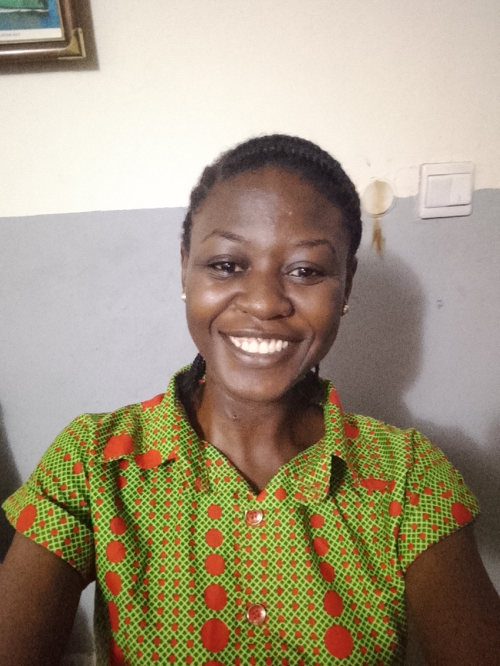 The image displays a headshot-style portrait of an adult female, positioned centrally and looking directly at the camera. Her dark skin, braided hair pulled back, and broad smile revealing white teeth are prominent. She wears small white stud earrings. Her short-sleeved collared shirt features a bright green base with a fine grid pattern of smaller green squares, overlaid with larger, irregular red circular motifs. Three orange-red buttons are visible on the shirt's front placket. The background consists of an interior wall painted in two horizontal sections: the upper portion is a light cream or off-white, and the lower portion is grey. In the upper left corner, a framed picture is partially visible, featuring a dark brown wooden frame with gold-colored corner accents. Indistinct green and blue elements are visible within the picture, along with partially legible text that appears to include "ILTON 2012". On the right side of the background, a circular brown stain or mark is present on the wall, below a white rectangular electrical light switch or outlet panel containing two visible toggles. The visual content of this image does not provide sufficient specific cues to definitively identify a precise location within Abuja, Nigeria.