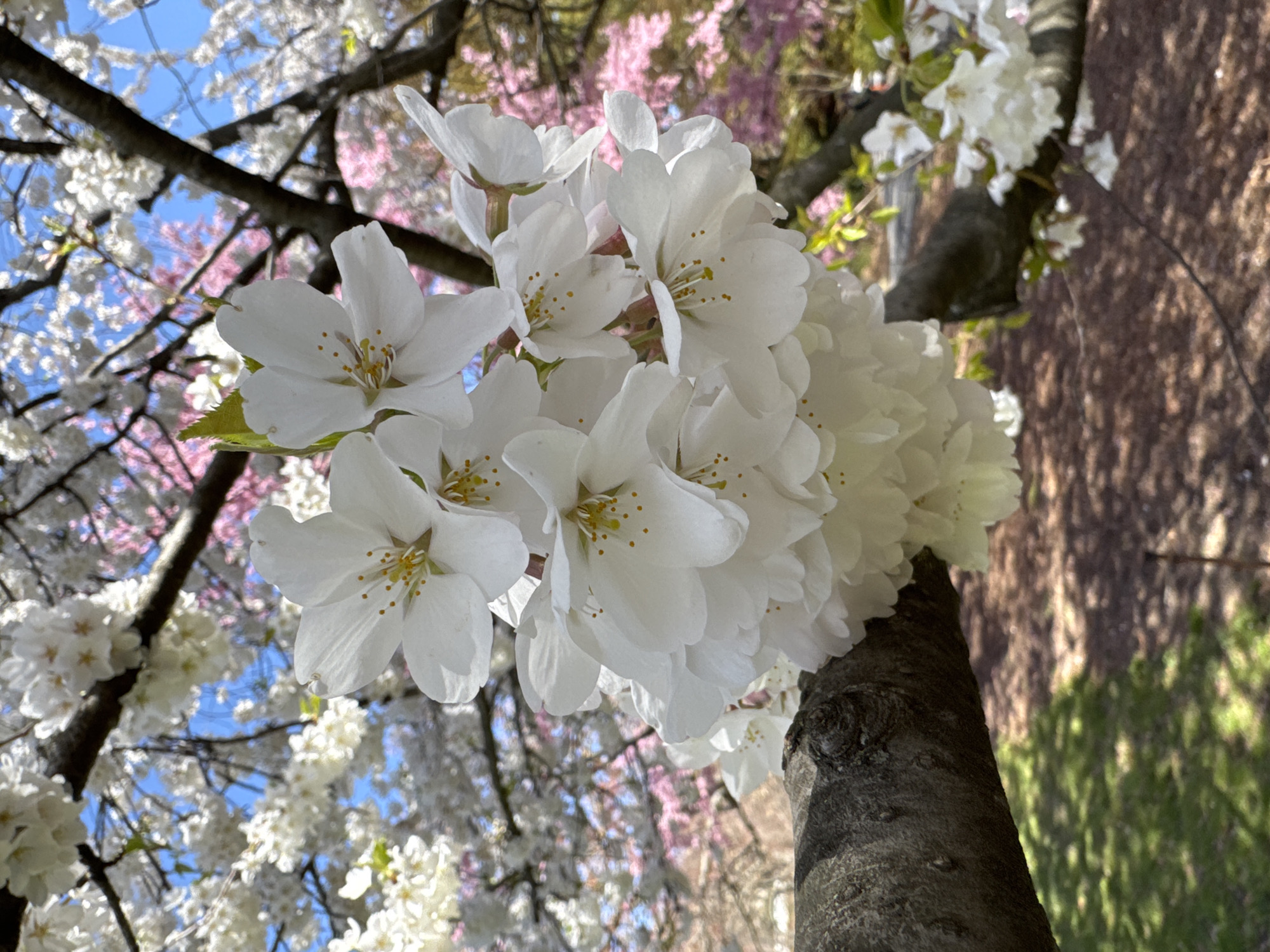 A low-angle close-up shows white cherry blossoms clustered on a tree branch in an outdoor setting. The bark of the branch is dark brown with textured ridges. The blossoms are in full bloom, exhibiting a pristine white color with visible yellow stamens in the center of each flower. In the background, there are other blooming trees with both white and pink flowers, creating a blurred, colorful backdrop under a blue sky. The scene is likely set in a park or garden during springtime. The city of New York is not determinable from the image. The United States of America is known due to instructions given.