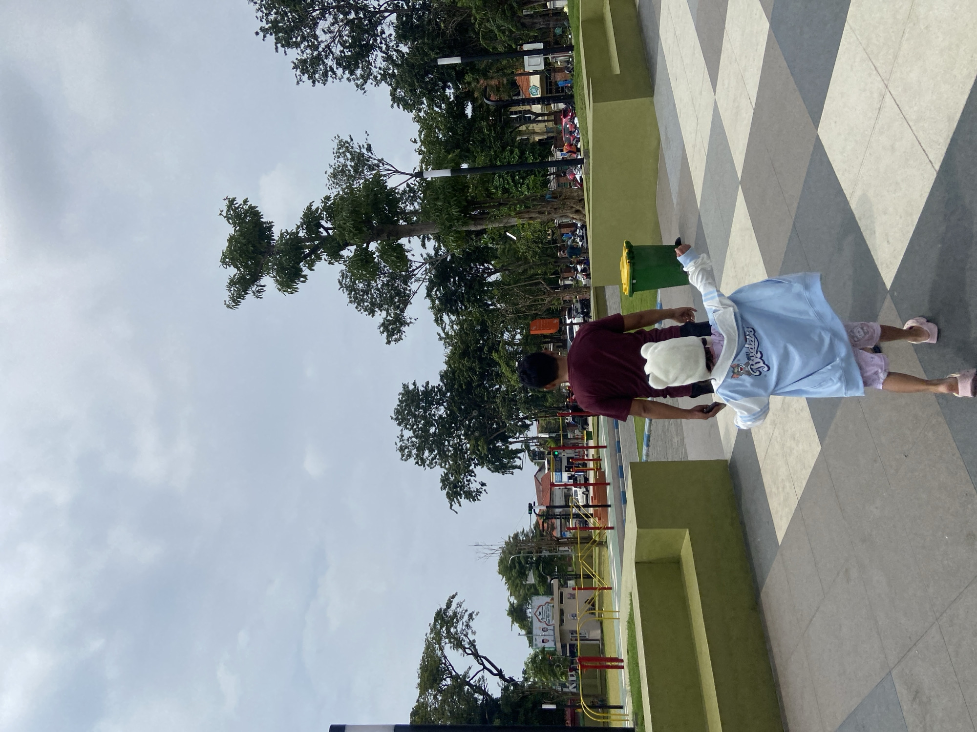 A low-angle, full-shot photograph depicts two individuals walking away from the camera on a checkered paved surface within a park in Sidoarjo, Indonesia, under an overcast sky. The foreground features a patterned paved walkway composed of alternating light and dark gray square tiles. In the mid-ground to the left, a bright green concrete structure serves as both a planter and a bench. To its right, a green plastic waste bin with a yellow lid rests on a patch of grass. The primary subjects are a man and a young child. The man, positioned to the left of the child, wears a maroon t-shirt and dark trousers, with his back facing the camera. The child, ahead and slightly to the right of the man, wears a light blue hooded jacket with a white collar and cuffs, featuring a cartoon graphic, a white hat with animal ears, pink shorts, and pink sandals. The child's right arm is slightly raised and bent at the elbow, pointing vaguely forward. Both individuals are walking forward, away from the viewpoint of the camera. The background reveals a public park environment with numerous mature trees with green foliage. Several black pole streetlights with white tops are interspersed throughout. To the left, a section resembling a children's traffic park or playground is visible, featuring yellow railings, red posts, and a paved area with blue curbing. Beyond this, a street is visible with parked and moving vehicles, including a white car and multiple motorbikes. Buildings with reddish roofs and a large banner advertising an event or service are also present. A green traffic light is discernible on the street to the mid-left. The sky above is uniformly light gray and overcast.