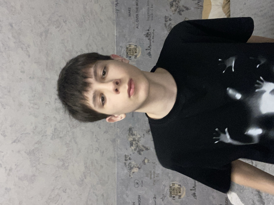A portrait of a young male subject, appearing to be a teenager, is captured indoors in what is identified as Andreyevo, Russia. The individual, with short dark brown hair and a neutral facial expression, faces the camera directly. He is wearing a black short-sleeved t-shirt featuring a blurred, light-toned graphic on the chest depicting several upward-reaching, translucent hand-like forms. The background consists of a wall segmented into two horizontal portions: the upper section displays a light grey, textured finish, while the lower section features a grey-toned world map pattern. Visible text within the map design includes phrases such as "SOMEDAY I'M GOING TO TRAVEL THE WORLD" and "MAKE ALL OVER THE WORLD." A segment of a bed, including a light-colored pillow and grey bedding, is partially visible on the right side of the frame behind the subject. The scene is evenly illuminated by ambient light.