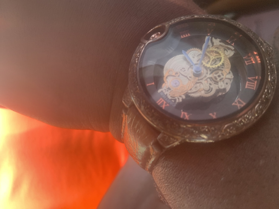 - "The image presents a close-up view of a person's forearm and wrist, featuring a gold-toned Cartier skeleton wristwatch with a brown leather-textured strap, located in Gudi, Nigeria" by FM-owPsI2, licensed under CC BY 4.0