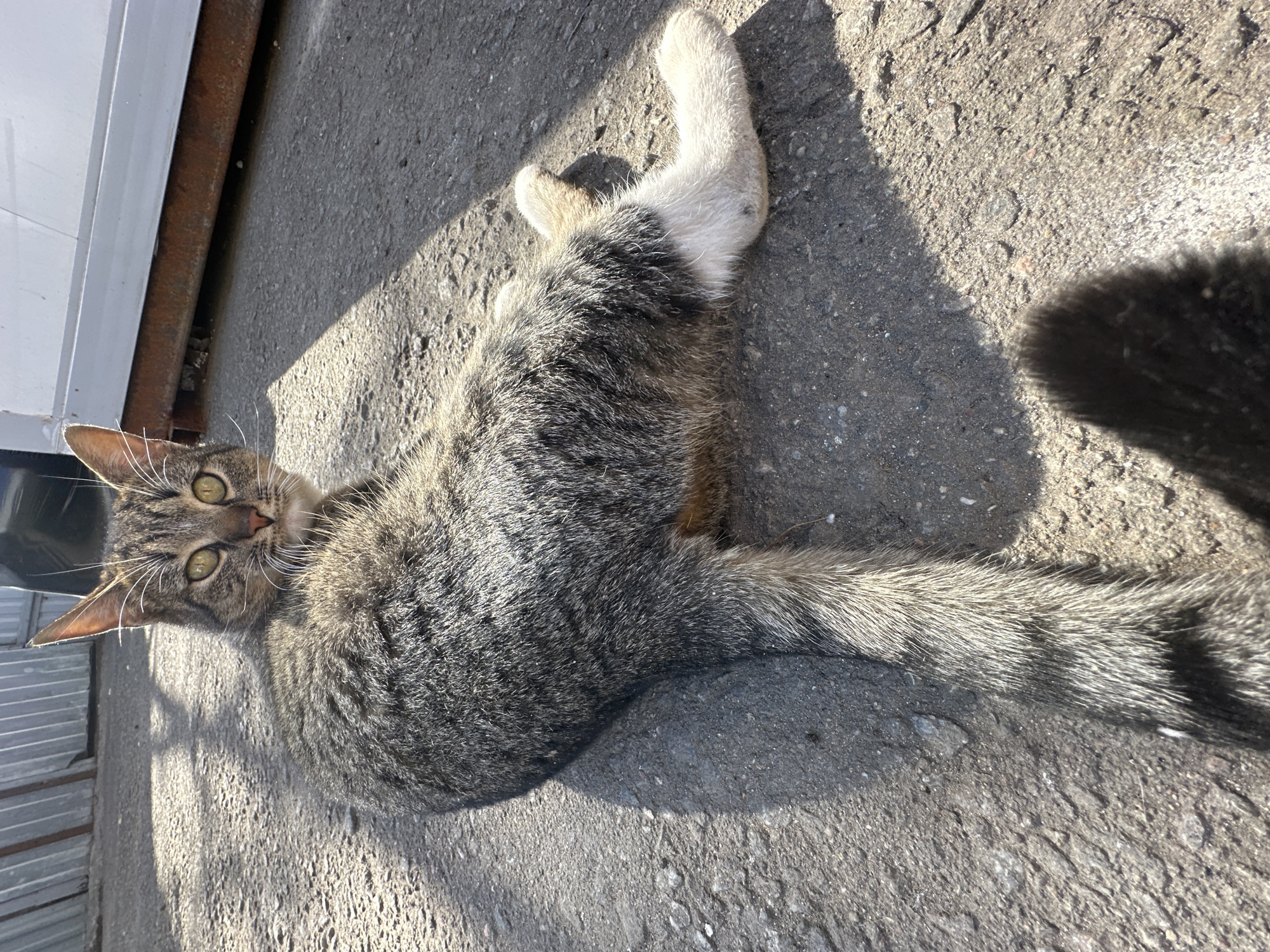 A grey tabby cat with white paws lies on a concrete surface, likely a road or pavement, in what appears to be the посёлок опытного хозяйства «Ермолино», Russia, based on the provided location information. The cat is positioned on its side, with its head turned toward the camera. Its tail is extended behind it, casting a shadow on the ground. Part of the concrete surface is next to a metal wall with horizontal slats. The scene is lit by bright sunlight.
