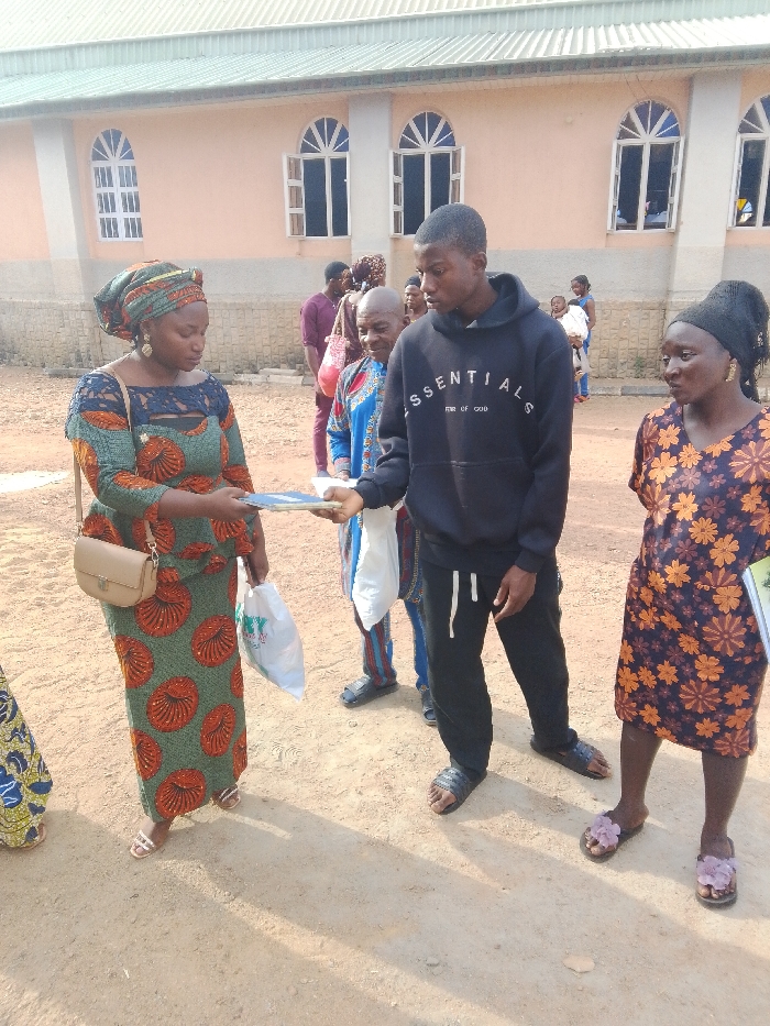 The image captures an outdoor scene in Jos, Nigeria, against the backdrop of a light peach-colored building featuring a green corrugated roof and multiple arched, white-framed windows. The ground is unpaved, consisting of dusty brown earth. In the foreground, a young male, wearing a black "ESSENTIALS FEAR OF GOD" hoodie, black track pants with white drawstrings, and black slide sandals, is extending a small, blue-covered booklet with his right hand. He appears to be in the process of handing it to a female on his left. This female is dressed in a traditional green, orange, and black patterned gown with a matching headtie, carrying a tan shoulder bag and a white plastic bag in her left hand. Her right hand is extended to receive the booklet. To the young male's right, another female in a dark floral-patterned dress and a dark head covering observes the interaction, holding a green book or folder in her left hand. In the midground, a male wearing a blue and white patterned traditional garment is partially visible behind the central young man. Several other individuals are present in the background, including one person holding a baby, indicating a gathering.