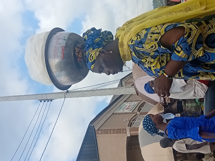 The image captures an outdoor urban scene in Lokoja, Nigeria, likely a market street, under an overcast sky