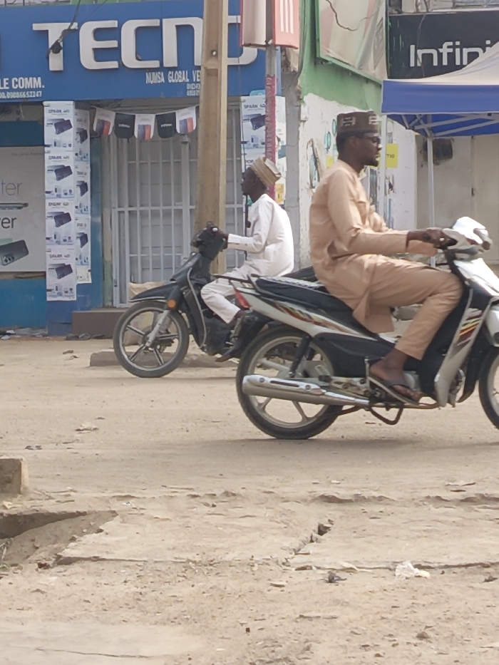 - "The scene depicts two adult males on motorcycles on an unpaved road in Fagge A, Nigeria" by FM-q2iZu1, licensed under CC BY 4.0