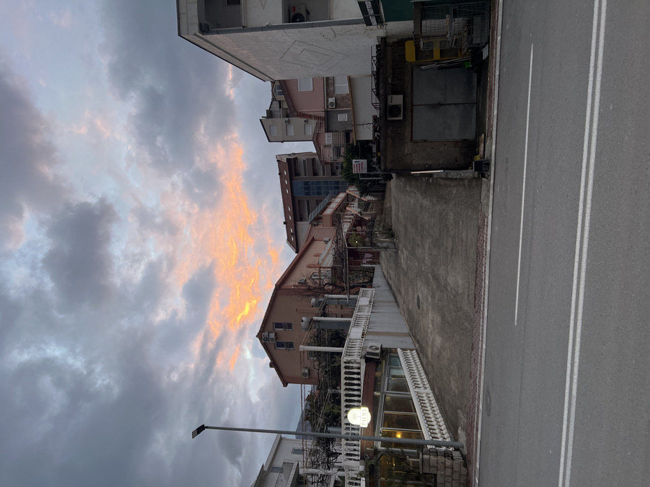An urban street scene under a dramatic sky. Buildings of varying heights line the left side, including a multi-story structure and a building with a white balcony. A narrow, sloped street extends from the buildings. The sky is filled with clouds, some highlighted with orange hues, suggesting either sunrise or sunset. A road with white lines on the right provides a stark contrast to the textured buildings and sky.