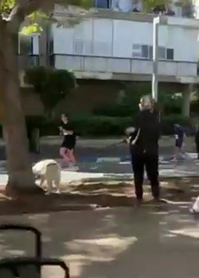 street in what appears to be a residential neighborhood with apartment buildings and trees. A group of people wearing matching blue shirts and shorts are running on the street. Other people are walking on the sidewalk. The video seems to be taken from a moving vehicle. The weather is sunny.
