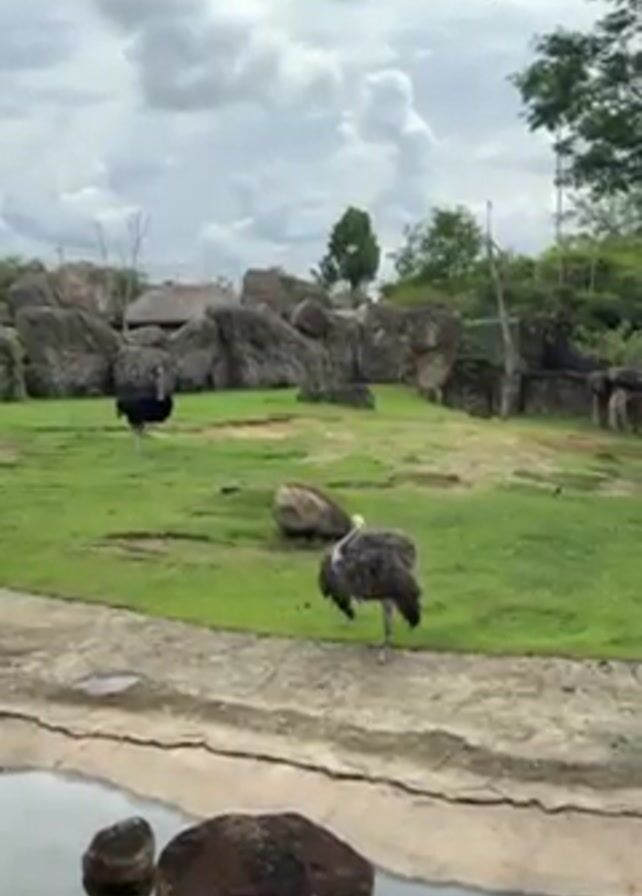 The camera captures a scenic view of an ostrich enclosure at a zoo or wildlife park