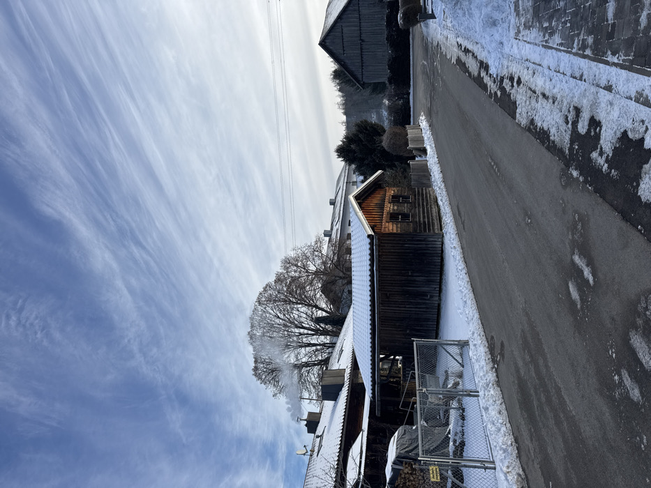 This image depicts a snow-covered street scene in Lohberg, Germany, on a clear winter day under a blue sky with prominent, elongated cirrus clouds. The asphalt road in the foreground shows patches of melting snow, slush, and ice, with clear tire tracks visible. Snowbanks line both sides of the road and a paved sidewalk on the right. On the left, a multi-story house with a dark, snow-covered roof features a chimney emitting a plume of white smoke, suggesting an active heating system. A satellite dish is affixed to the roof. Adjacent to the house is a rustic, dark brown wooden shed or extended carport with a snow-covered roof and two small windows on its front face, facing the street. In front of this structure, a metal chain-link fence with a yellow warning sign encloses an area containing a neatly stacked pile of firewood covered by a dark tarp. Bare deciduous trees, lightly frosted, are visible behind the house, partially obscured by the smoke. Further down the street on the right, a large, dark wooden barn-like structure with a snow-covered roof is partially visible. The background consists of rolling hills sparsely covered with deciduous and evergreen trees, all under a bright sky with the sun at a low angle, casting distinct shadows. No individuals are present in the scene.