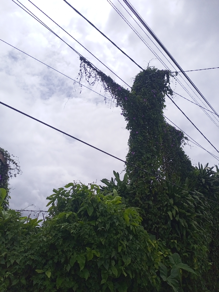 The scene depicts an outdoor environment in Meyong, India, under an overcast sky. A prominent utility pole or similar vertical structure, positioned right of center, is entirely engulfed by dense, dark green climbing vines, some bearing small purple flowers. Multiple black utility lines, likely electrical or communication, traverse the upper and middle portions of the frame diagonally and horizontally. These lines are partially obscured by and intertwined with the heavy vine growth, particularly in the upper central and left areas where tendrils hang downwards. Additional dense green foliage occupies the lower left quadrant and extends across the bottom, with some plants exhibiting broader leaves. No people are present.