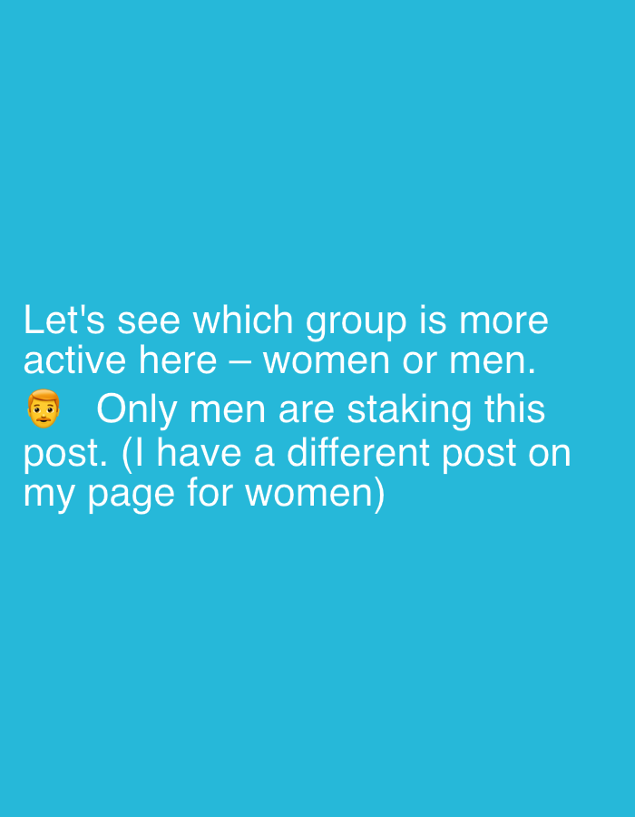 The image features a blue background with white text that reads: "Let's see which group is more active here - women or men. 👱 Only men are staking this post. (I have a different post on my page for women)". The 👱 emoji is of a man with blonde hair. The image is not related to the city of Ungasan, Indonesia.