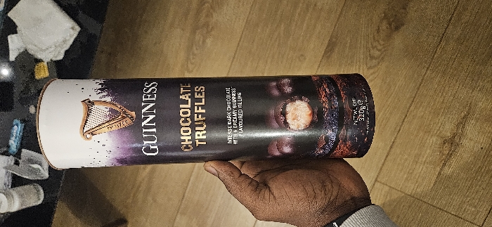 - "A tube of Guinness Chocolate Truffles is held in someone's hand, against a blurry backdrop of a wooden floor" by FM-WsxrI3, licensed under CC BY 4.0