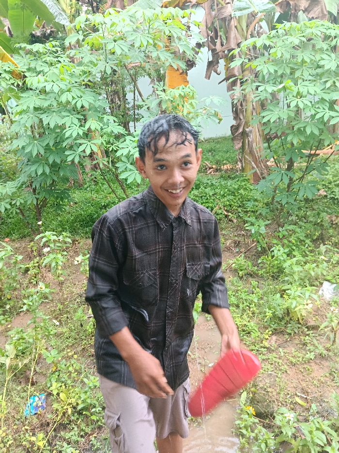 A young man stands smiling in a lush, green outdoor setting. He wears a dark plaid shirt, unbuttoned, and khaki shorts. His hair is wet. He holds a red, rectangular object, possibly a container or tool, from which water appears to be pouring. Behind him, a variety of plants and trees create a dense, natural backdrop, with some leaves having a distinctive star-like shape. The ground appears damp or muddy, suggesting recent rain or irrigation.