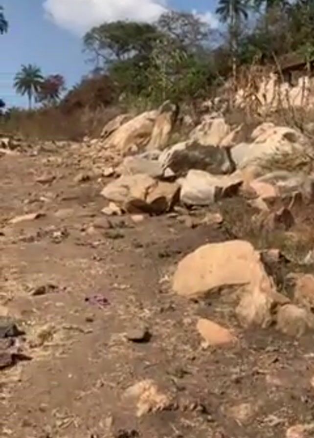 The camera scans across a rocky, dirt terrain dotted with large, light-brown rocks