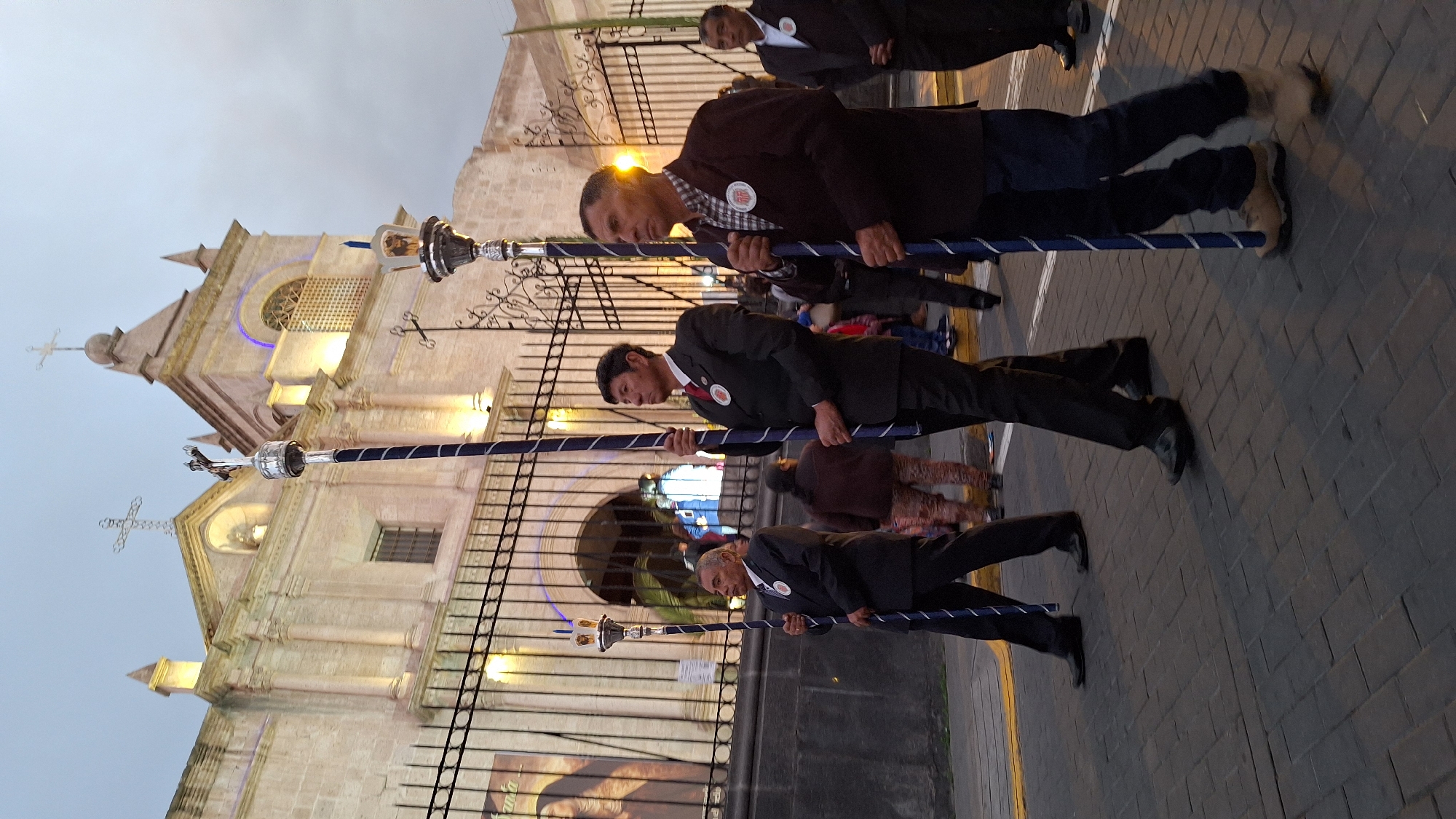 In Arequipa, Peru, three men in dark suits and shoes carry staffs