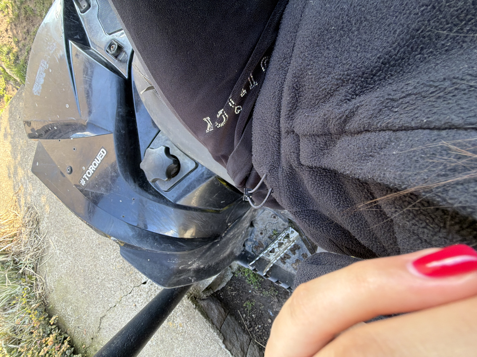 partial view of an all-terrain vehicle (ATV) on a concrete surface. The front left fender of the ATV is visible, with the word "#TORQUED" printed on it. A person is seated on the ATV, wearing dark-colored pants with decorative lettering on the side and a dark fleece jacket. A hand with a red painted fingernail is visible in the lower right corner of the image. The ATV is parked near a patch of grass and stone curb. Based on the available information, the location is Rudartsi, Bulgaria.