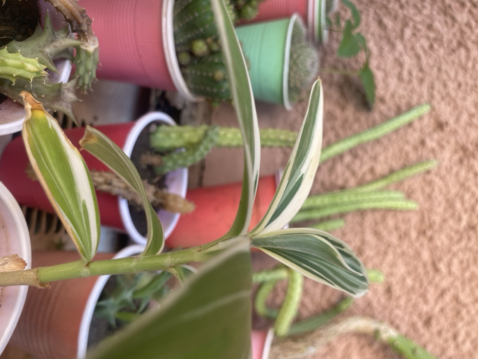 The scene, observed in an unspecified outdoor or semi-outdoor location within Barden Yana, Nigeria, features a collection of potted plants. In the foreground, a variegated plant with green and cream-colored striped leaves stands prominently, its stem light green and visible. The leaves display distinct longitudinal stripes, with some lower leaves showing yellowing and browning at the tips. This plant is contained within a white or translucent plastic cup. Behind it, a dense arrangement of various cacti and succulents is visible. These include tall, slender green cacti, one with a distinct curved or serpentine growth, and another with multiple rounded protrusions, suggesting a *Mammillaria* or similar genus. Other plants include smaller, spherical cacti and one with thorny, star-shaped segments. These plants are housed in a variety of plastic containers: several bright red cups, one light green cup, and additional white or translucent cups. The red and green cups are consistent in design, suggesting recycled drinking cups used as planters. The background consists of a reddish-brown, roughly textured wall, which appears to be stucco or brickwork, indicating an exterior building surface. Natural light illuminates the scene, creating soft shadows. No human subjects are present, and no dynamic actions or interactions are depicted. The focus is solely on the stationary plant arrangement.