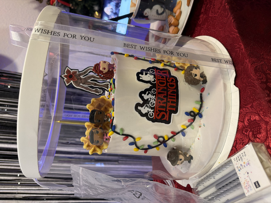 A "Stranger Things" themed cake is displayed in a clear plastic container, adorned with a white ribbon that reads "Best Wishes For You