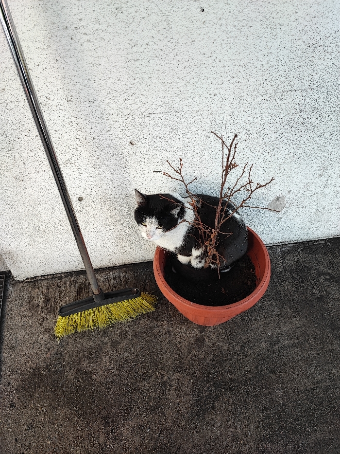 - "The image displays an outdoor scene in Obruchishte, Bulgaria, featuring a domestic cat, a plant pot, and a broom positioned against a wall" by FM-7CnuG3, licensed under CC BY 4.0