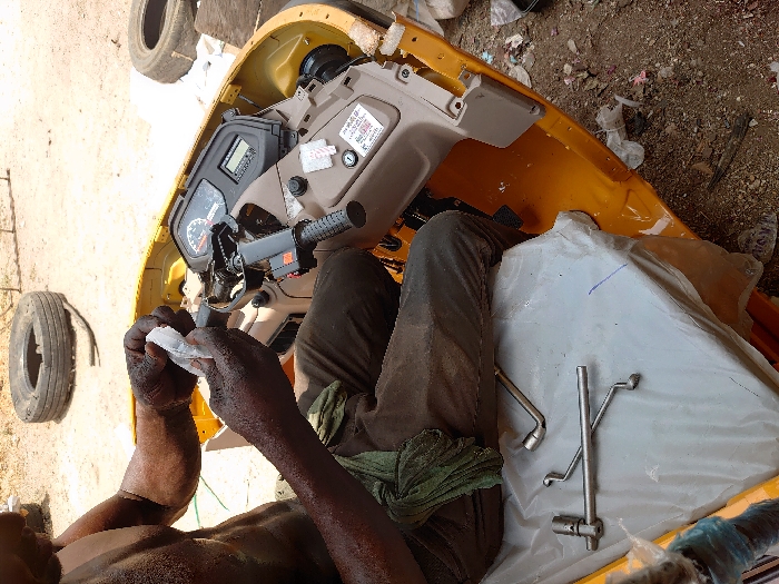 In an outdoor setting in Adankolo, Nigeria, a dark-skinned male mechanic is performing repairs on a yellow three-wheeled vehicle, likely an auto-rickshaw