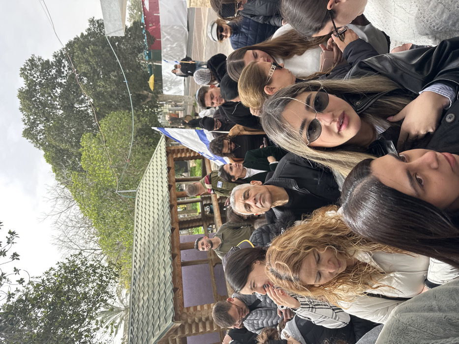 The image displays a dense outdoor gathering in Meitar, Israel, under an overcast sky. Approximately 30-40 individuals, primarily adults of mixed ages, are visible, occupying the foreground and midground. In the immediate foreground, a woman with light brown hair and sunglasses looks towards the viewer. To her left, a woman with curly light brown hair looks down, and another woman with dark hair also looks downwards. Behind them, a man with short grey hair gazes upward. Further back, a man in a green shirt looks forward, and an individual wearing an Israeli military uniform with a visible flag patch is partially obscured. An Israeli flag on a pole is visible in the midground, positioned to the right of the military personnel. A wooden log cabin-style structure with a green gabled roof stands in the midground-background. The background also includes various trees, some with green foliage and some bare, along with temporary white structures resembling tents or barriers, and a yellow umbrella. Several attendees are observed holding or viewing cell phones.