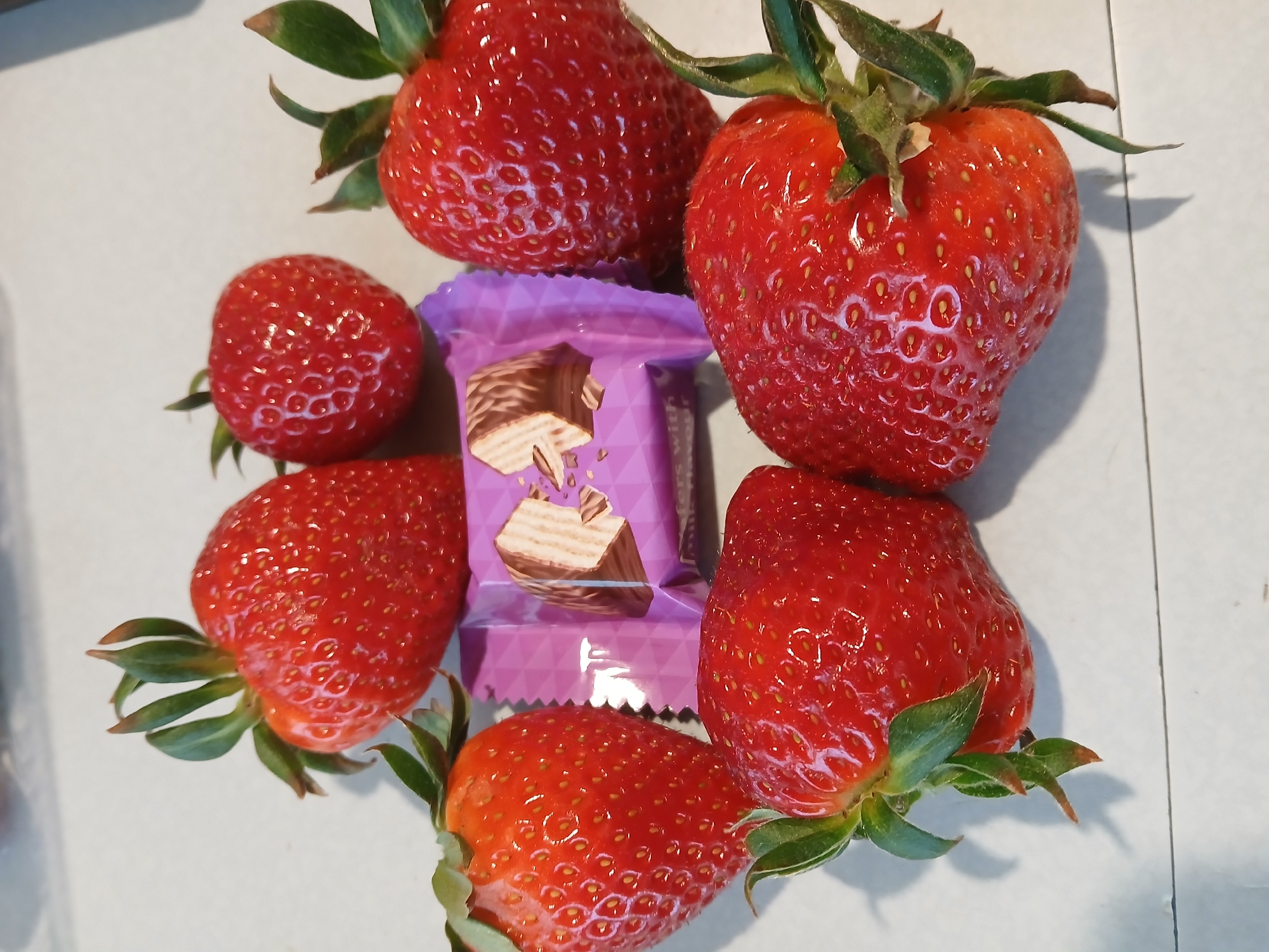 six strawberries arranged around a purple-wrapped wafer candy bar on a white surface. The strawberries are red and ripe, with green stems and leaves. The candy bar is in the center, featuring an image of a chocolate wafer on the wrapper. The background is a plain white surface, likely a table or countertop. The image does not show any indication of the location in the city of Vratsa, Bulgaria.