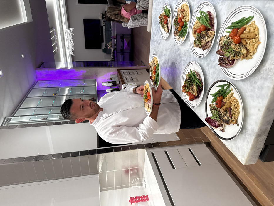 A male chef with short dark hair and a beard, wearing a white chef's jacket and dark pants, stands in a modern, high-end residential kitchen in Naples, United States of America. He is holding two dinner plates, one in each hand, and appears to be in the process of arranging or serving. On the light grey and white veined marble counter in front of him, seven additional identical plated meals are meticulously arranged. Each plate contains a main course consisting of a piece of grilled fish or poultry, a portion of orzo or grain pilaf, green beans, halved cherry tomatoes, small cooked carrots, a piece of radicchio, and a garnish of fresh herbs or microgreens. The kitchen features white flat-panel cabinetry and a light-colored tiled backsplash. To the left, a red water bottle and a clear pitcher rest on the countertop. In the background, modern glass-front display cabinets with internal lighting, some exhibiting a purple hue, are visible, showcasing bottles and glassware. Further in the background, a living or dining area is partially visible, featuring a large wall-mounted television, light-colored seating arrangements, and a decorative chandelier. At least two individuals, including a person with blonde hair wearing a pink top, are seated in this distant area. The overall lighting is artificial and bright, with distinct purple accent lighting in the background.
