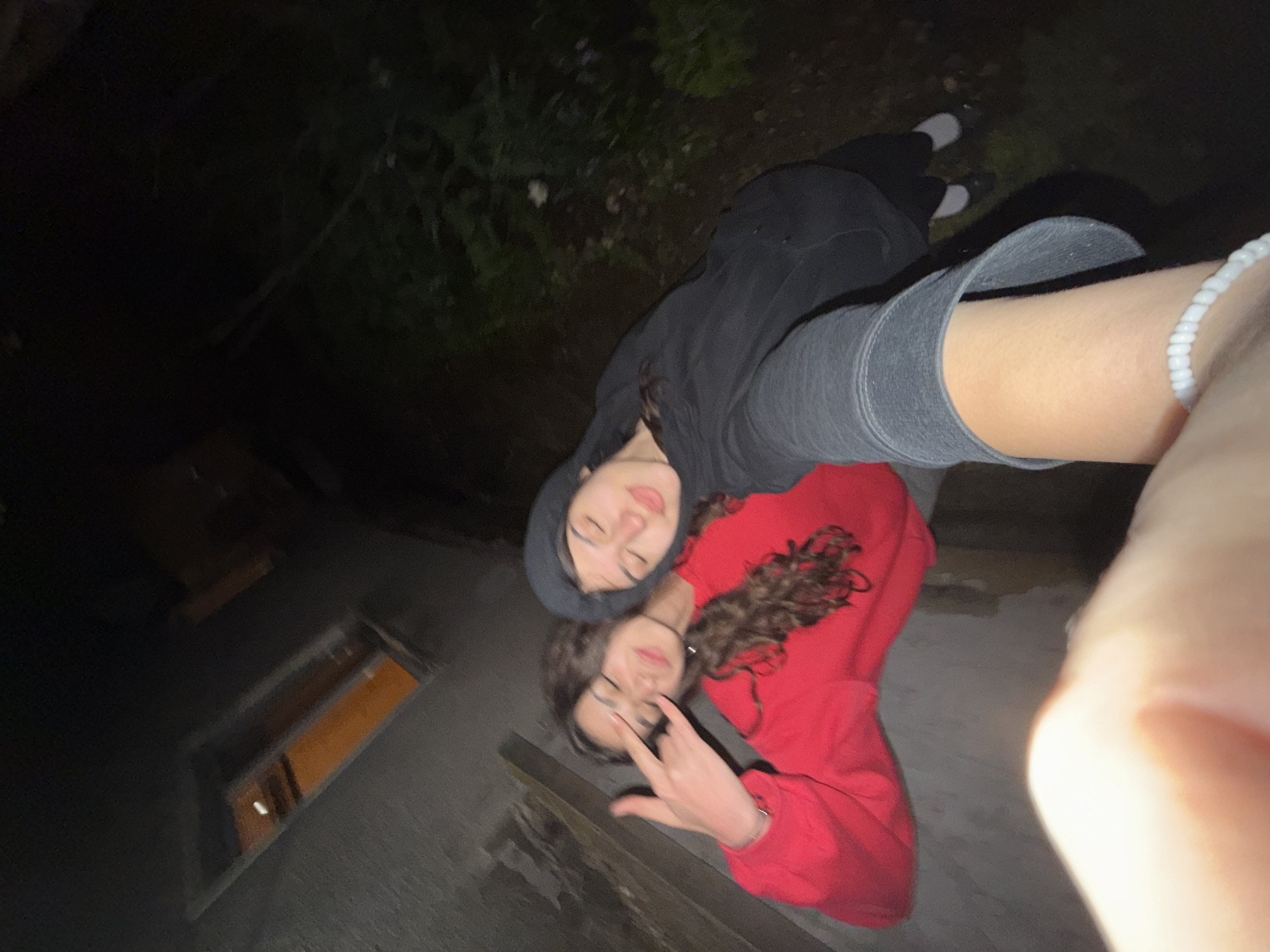 Two people are positioned outside in the night with dark surroundings. The person in the foreground wears a red long-sleeved shirt and glasses and is giving a "rock on" hand gesture. The other person in the background wears a gray hoodie. In the background, there is a building with a visible window. There are also patches of greenery. This location is in Mihailovo, Bulgaria.
