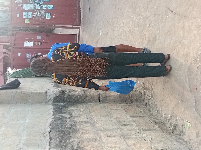 A forensic examination of the image reveals an outdoor scene in the city of Unknown, Chad, featuring two individuals positioned in front of a pair of red metal gates. The primary subject, a female, stands with her back to the viewer, identifiable by her long, brown, tightly braided hair styled into a ponytail with curly ends reaching her lower back. She wears a long-sleeved dark shirt adorned with gold and orange ornate patterns, dark trousers, and brown flat sandals. In her left hand, she carries a blue plastic bag. Behind and to the right of the primary subject, a second individual, likely male, is partially visible, wearing a blue long-sleeved shirt and dark shorts, with dark slip-on shoes. Both individuals appear to be standing or moving towards the metal gates in the background. To the left of the subjects is a light-colored concrete block wall with a visible darker, stained section along its lower portion. A dark fabric and a green fabric piece are draped over the top of this wall. The ground in the foreground is an uneven, light-colored dirt or concrete surface, with minor debris visible near the wall. The background consists of two tall, red metal gates, possibly corrugated, covered with various weathered papers, posters, and stickers, including one visible word "JOE." A gap between the gates reveals an area beyond. Above the gates, a metal structural framework is discernible.