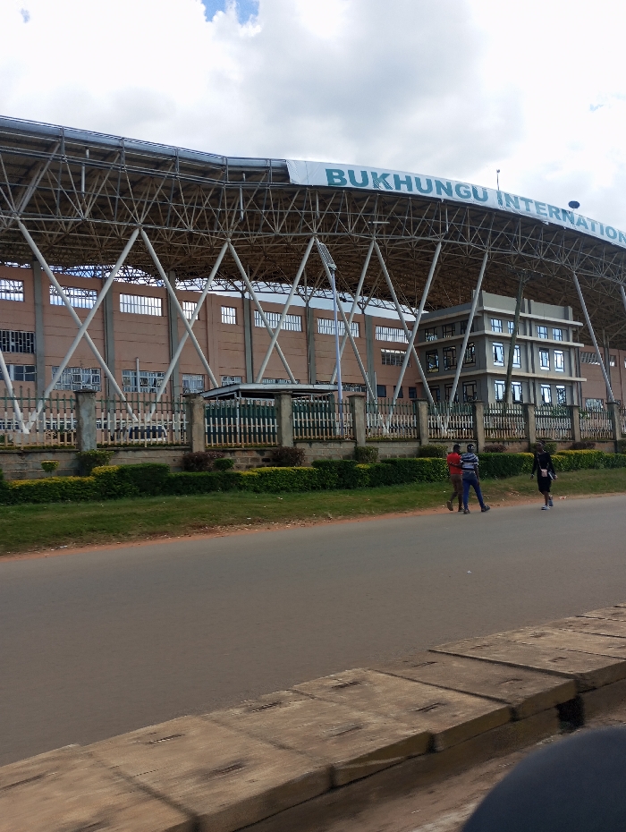 An exterior daylight scene in Sheywe Ward, Kenya, depicts Bukhungu International Stadium from across an asphalt road