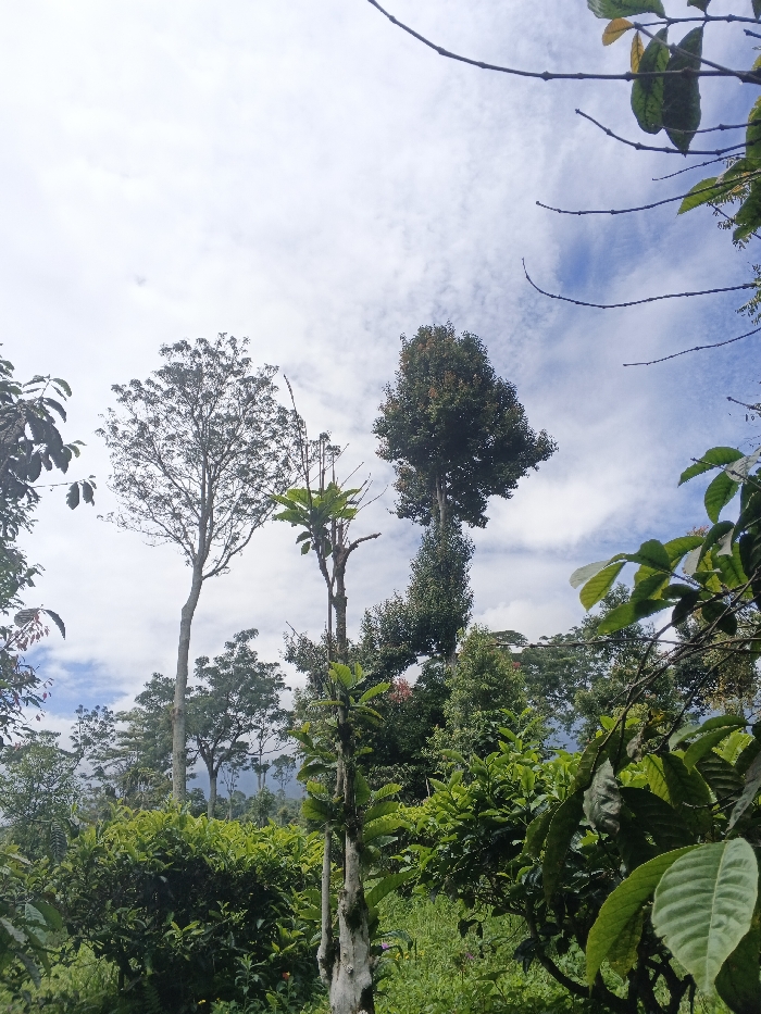 Tall trees stand against a backdrop of a partly cloudy sky. Various shades of green foliage, bushes, and trees fill the foreground. A slender tree with sparse branches stands to the left, contrasting with a more dense, rounded tree to its right. The greenery gives a sense of lushness and natural growth.