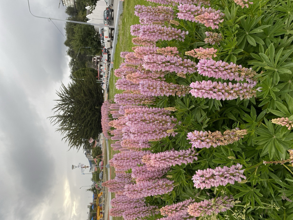 A vibrant row of pink lupine flowers with green foliage stretches across the foreground. In the background, a dark green evergreen tree stands to the left. Cars line the road behind the flowers, with trees and buildings visible further back. The sky is overcast with gray clouds. The scene appears to be a park or public space, captured on a cloudy day.