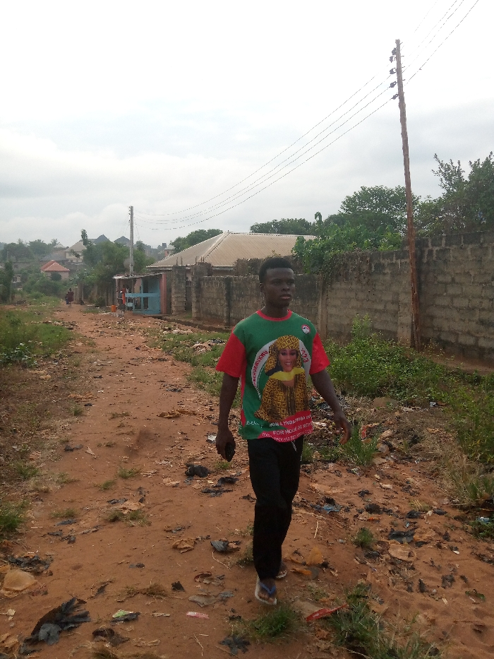 A young man walks down a dirt road lined with trash. He wears a green and red t-shirt with a woman's image and text. The road leads past buildings with brick and corrugated metal roofing. A weathered wall borders one side of the road, punctuated by overgrown vegetation. Telephone poles with lines stretch across the sky above. The scene is overcast, suggesting a cloudy day.