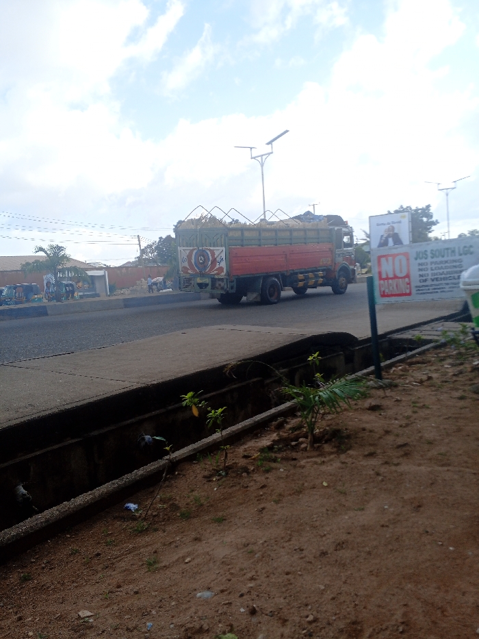 The image depicts a daytime outdoor scene on a paved road in the Jos South Local Government Area, Jos, Nigeria