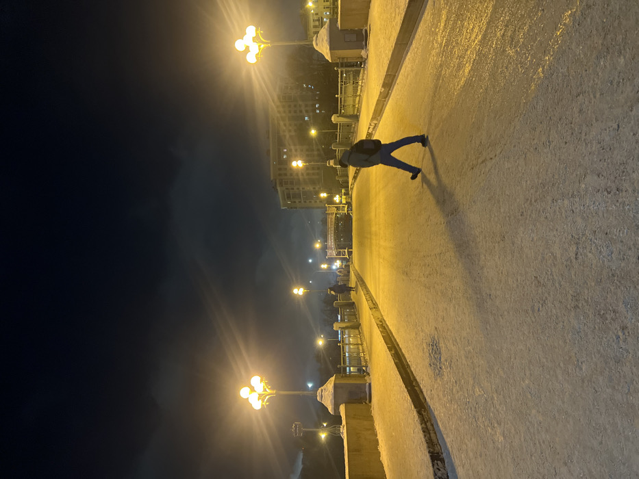 A night scene shows a person on a bridge under warm streetlights. The bridge stretches towards a distant building, also illuminated. The sky is dark, possibly cloudy. The bridge surface is illuminated in warm hues. The individual is walking, their shadow stretching across the bridge. The photo's orientation is rotated.