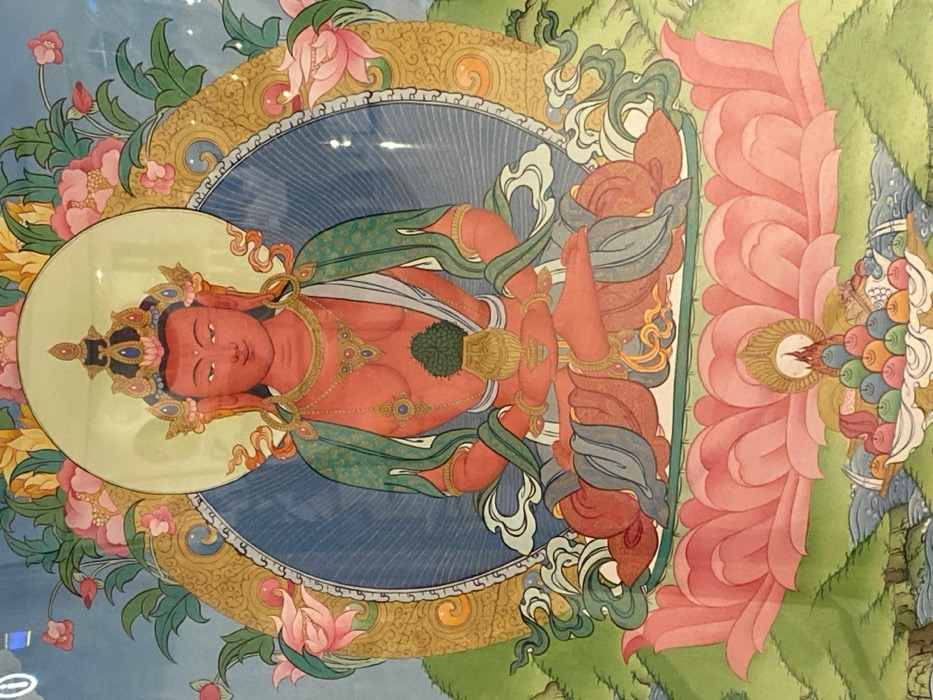 The image displays a vibrant, multi-colored thangka-style painting or print, presented within a frame, likely under glass as indicated by reflections in the upper left quadrant