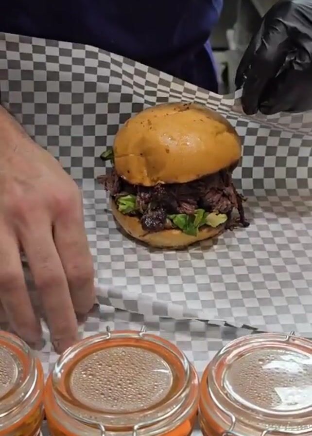 A person wearing black gloves is wrapping a sandwich with black-and-white checkered paper. Three glass jars with orange lids sit in a row in front of the sandwich. The person is wearing a blue shirt. The sandwich appears to have meat and lettuce on it. The wrapping paper is on a white surface with light grey checkerboard pattern.