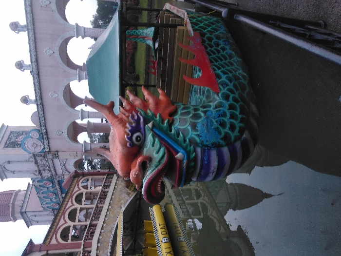 The image depicts an outdoor scene at the Parque de Diversiones, located in Ciudad de San José, Costa Rica. In the foreground and slightly right of center, a large, multi-colored dragon-headed boat floats in calm, dark water. The boat's head is sculpted with an orange-red base, featuring green, blue, and purple details, black eyes, white teeth, and prominent orange spikes/horns. Its body is patterned with teal-green scales, accented by red dorsal fins along the side, and contains light-colored wooden bench seats under a small, light green canopy. To the left of the dragon boat, another yellow boat with "TAXI BOAT" stenciled in black on its side is visible, also floating in the water. The background is dominated by an elaborate architectural complex characterized by pale pink/peach walls, white columns, and multiple arches, reflecting a whimsical or themed design. A red-tiled conical roof of a tower is visible on the far left, alongside decorative light blue panels and circular motifs on the building facades. Several small, round ornamental figures are perched along the roofline of one section. A bridge with multiple arches extends over the water on the left, connecting different parts of the complex. The still water perfectly reflects the background buildings and the overcast, light grey sky. A dark, ornate metal railing runs along the bottom right edge of the frame, separating the water from an unseen pathway. No individuals or specific actions are depicted within the scene.