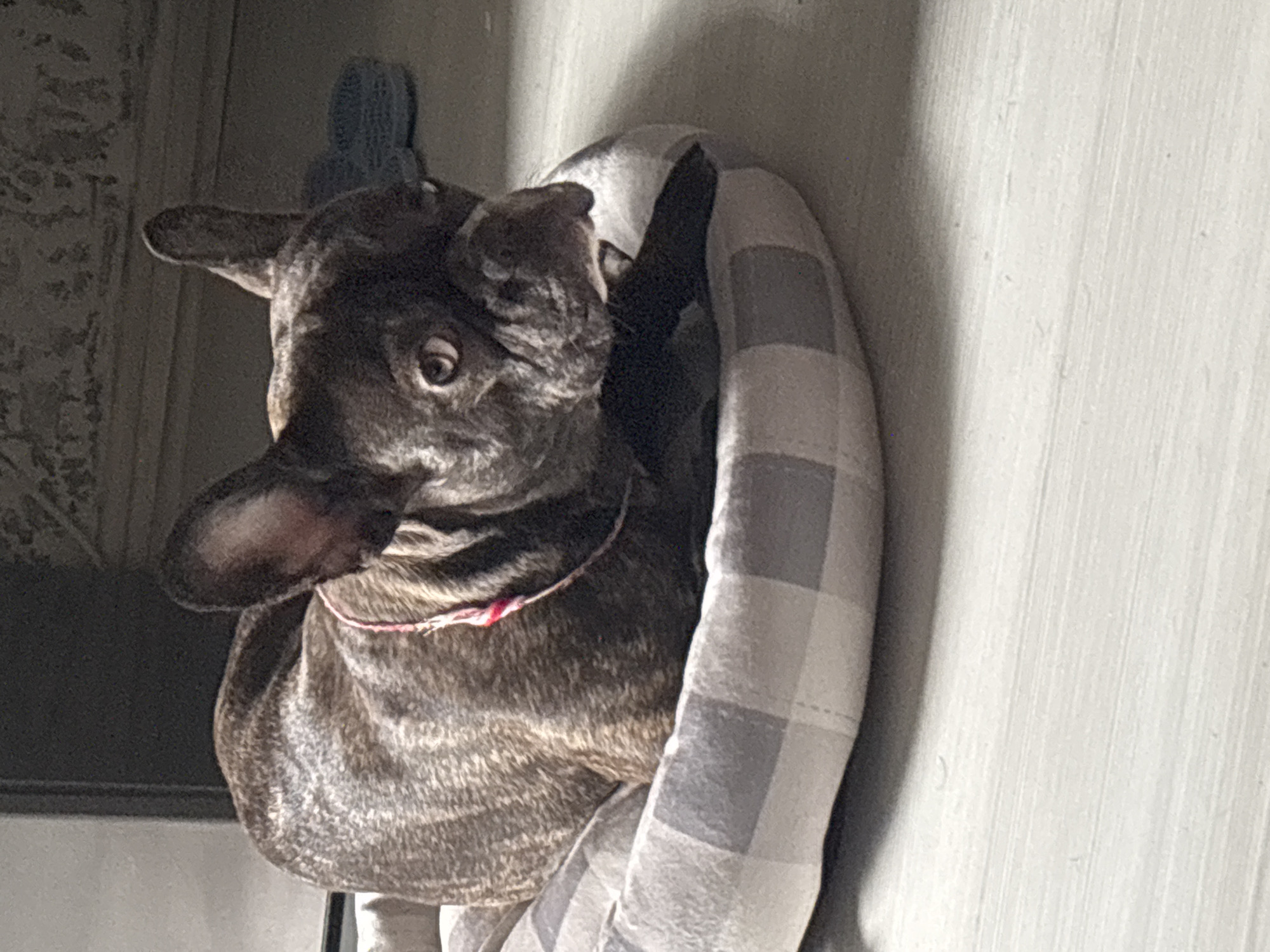 A brindle French Bulldog, wearing a thin red and white patterned collar, is resting in a circular dog bed featuring a grey and white checkered pattern