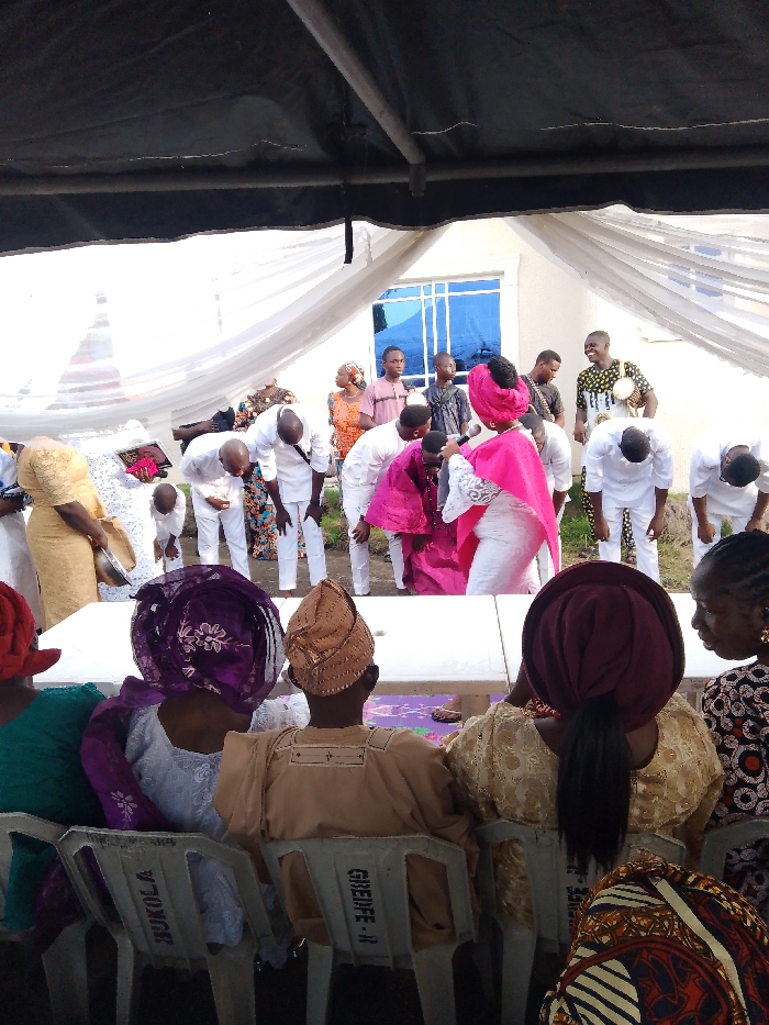 The image depicts an outdoor ceremonial gathering under a black canopy with white drapes, located in Adankolo, Nigeria