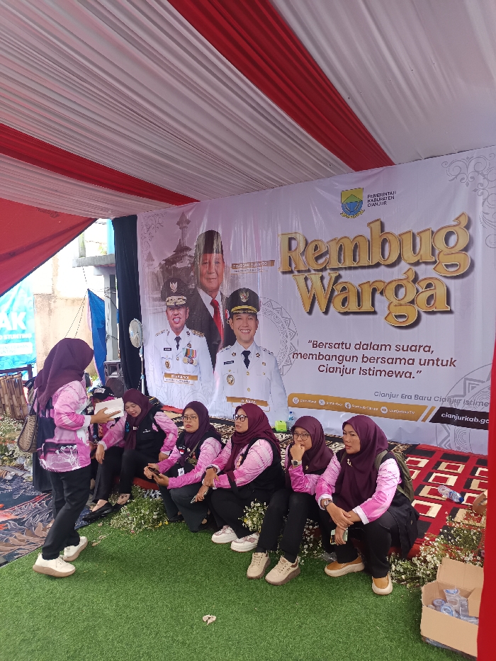 This image captures an outdoor event under a tent structure in Kawungluwuk, Indonesia. The tent's ceiling is adorned with draped red and white fabric panels. The ground is covered with artificial green turf in the foreground, transitioning to a patterned mat further back. A large white banner acts as the backdrop, displaying "Pemerintah Kabupaten Cianjur" (Government of Cianjur Regency) with its logo, the words "Rembug Warga" (Citizen Deliberation) in golden script, and the slogan "Bersatu dalam suara, membangun bersama untuk Cianjur Istimewa." The banner features images of four men: a prominent central figure, and three men in uniform below him, identified by names such as "H. Herman Suherman," "TB. Mulyana Syahrudin," and "Dr. H. Wawan." The banner also includes social media icons and "cianjurkab.go.id." Eight women, all wearing hijabs, are present. Most are dressed in light-colored, long-sleeved shirts under dark vests and dark pants, many with ID badges. One woman stands on the left, holding a white object in her hands, facing a group of seven women who are seated or squatting on the ground. The seated women appear to be observing, with one individual looking at a mobile phone. White flowers are arranged along the base of the banner. A cardboard box containing multiple small plastic cups of liquid is visible on the far right. A wooden object is partially visible on the far left. An exterior building and a blue tarp are discernible in the background.