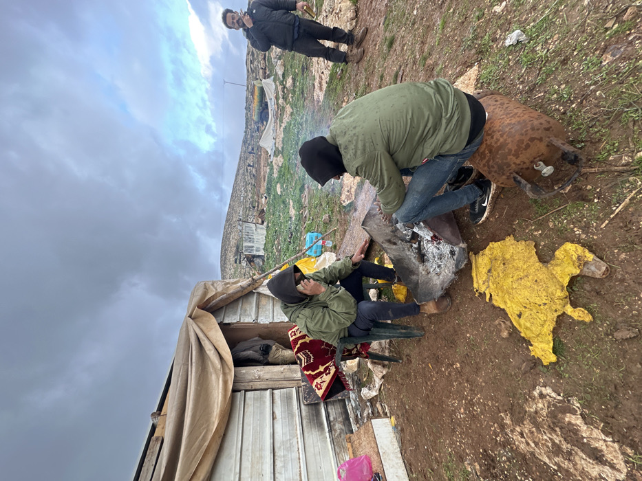 The image depicts an outdoor scene in Mikhmas Bedouin, Palestinian Territory, under an overcast sky. In the foreground, three adult males are situated around a small fire contained within a makeshift metal basin on muddy ground. To the left, a man wearing an olive green hooded jacket, dark pants, and brown boots is seated on a green plastic chair, which is partially covered by a red and gold patterned rug. He holds a mobile phone to his right ear, appearing to be on a call, and extends his left hand towards the fire. To his right, another man, wearing a dark hooded jacket, blue jeans, and black sneakers, is seated on a rusted, horizontal metal tank, facing the fire with his hands near it. A crumpled, dirty yellow tarp lies on the ground in front of the seated men. To the right of the fire, a third man, with a beard and mustache, stands in a dark jacket and pants. He holds a lit cigarette to his mouth with his right hand and a small amber-colored bottle in his left hand, looking towards the left. In the left mid-ground, a rudimentary shelter with corrugated metal walls and a light brown fabric awning/roof extension is visible. A person is partially discernible within its open doorway. A pink plastic bag and other items are near the shelter's base. The surrounding environment consists of rocky, uneven terrain with sparse green vegetation, leading to distant low hills under a predominantly grey, cloudy sky with some lighter patches on the horizon. Further back in the landscape, additional makeshift structures and a yellow water tank on a trailer are visible, along with a utility pole.