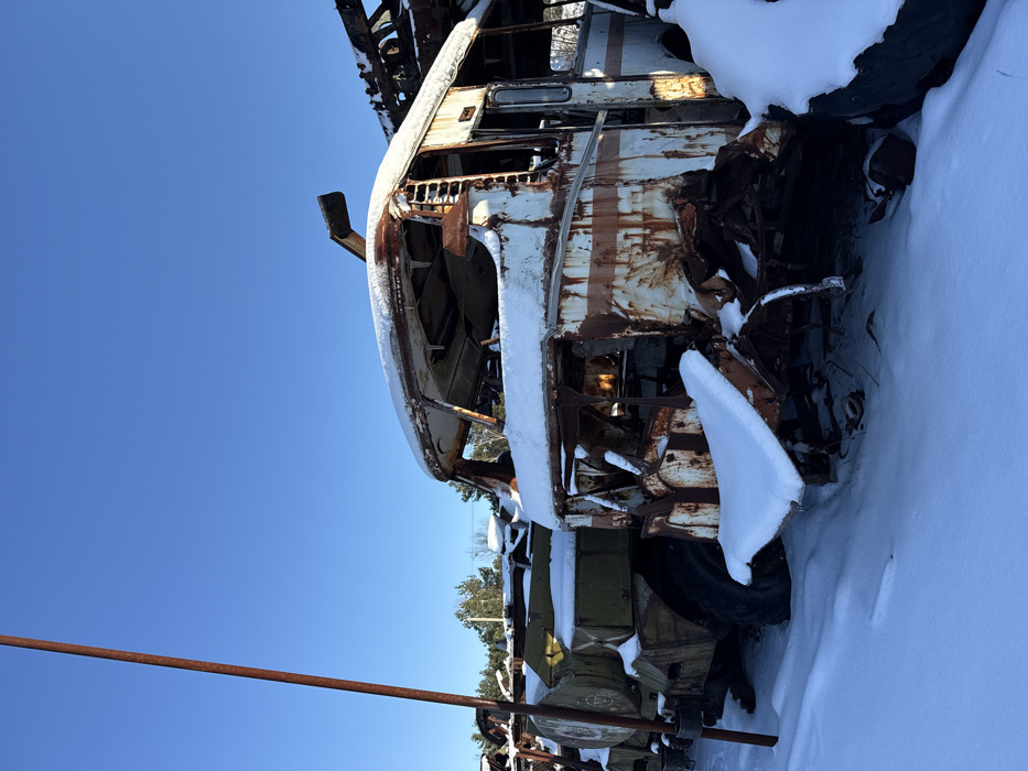 The scene depicts a winter landscape within the city of Unknown, Ukraine, specifically an outdoor vehicle graveyard