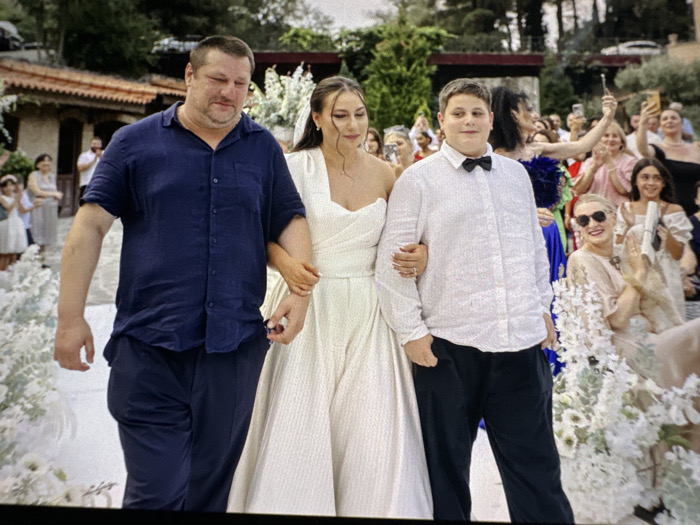 A mid-range outdoor photograph depicts a wedding procession with three central figures walking down a white floral-decorated aisle, reportedly in Colombes, France. The central figure is a young adult female, wearing a white strapless wedding gown, with long dark hair and a veil, and a ring on her left ring finger. She is escorted by an adult male on her left and an adolescent male on her right. The adult male, approximately 40-50 years old, has short brown hair and wears a navy blue short-sleeved button-up shirt and matching trousers; his expression is contemplative. The adolescent male, approximately 10-15 years old, has short brown hair and wears a white long-sleeved shirt with a black bow tie and dark trousers; his expression is neutral. Both males are holding the central female's arms. In the background, a crowd of approximately twenty-five to thirty guests, mostly adults, lines the aisle, observing the procession. Many are clapping and holding up smartphones to record. Visible elements among the guests include a woman in sunglasses holding white flowers and another in a blue garment with prominent shoulder details. The environment features lush green trees, foliage, and a rustic-style building with a terracotta roof on the left. The aisle is carpeted in white and bordered by dense white floral arrangements, primarily hydrangeas.