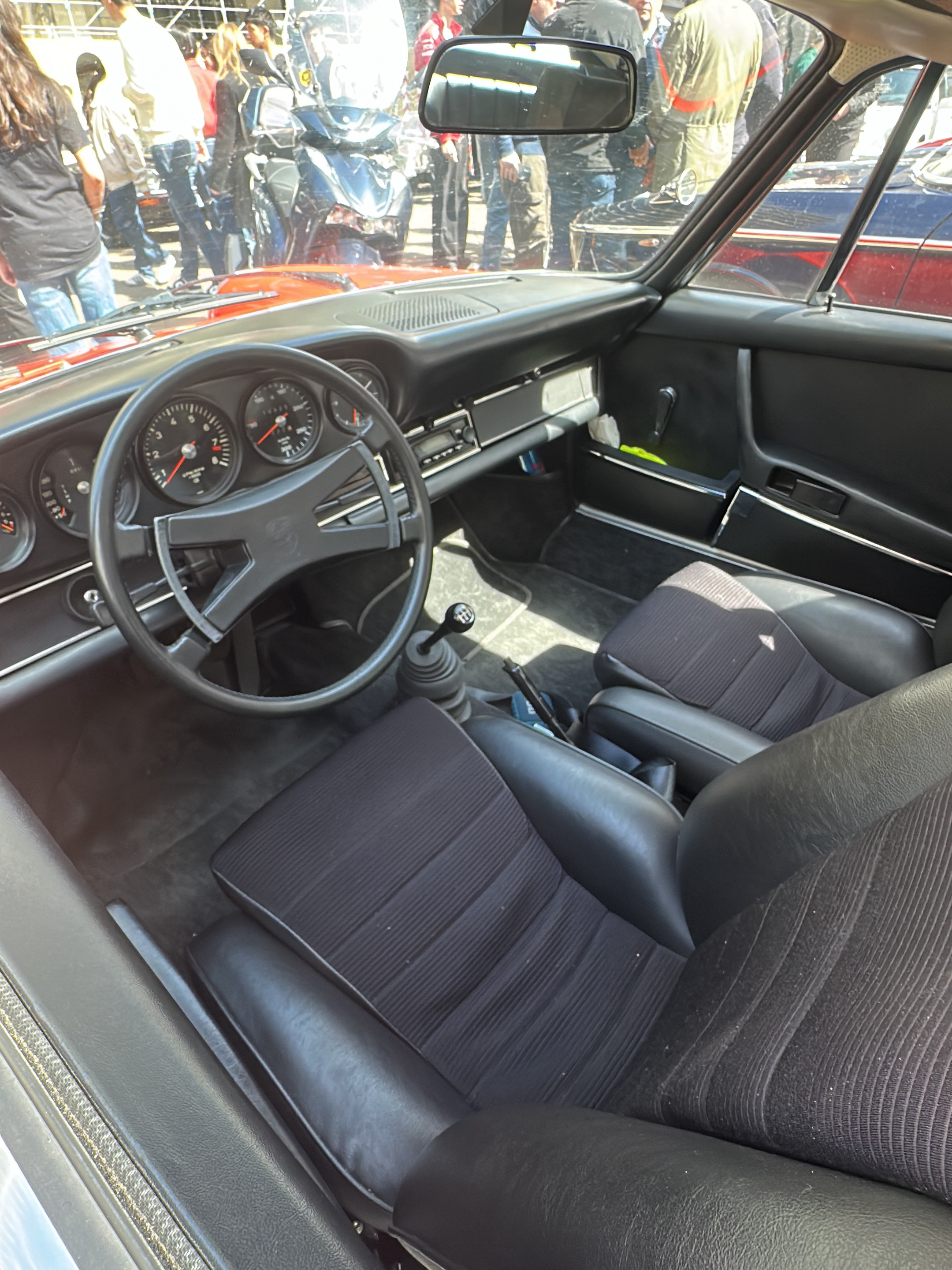 The interior of a classic car, likely a vintage Porsche, is visible with black bucket seats and a black dashboard with a three-spoke steering wheel