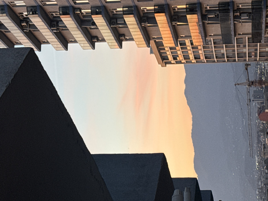 This image depicts a sunset over the city of Batumi, Georgia. In the foreground, a dark grey concrete architectural overhang, possibly part of a building's roof or balcony, occupies the upper-left quadrant, framing the scene. Two white cylindrical objects are affixed to a vertical concrete surface below this overhang. To the right, a multi-story residential building extends vertically, featuring numerous balconies with light-colored, possibly glass, railings on its upper floors, which reflect the warm orange and yellow hues of the sunset. Lower sections of the building show balconies with darker, possibly metal, railings. Multiple outdoor air conditioning units are mounted on the building's exterior beneath windows or on balconies. The building's facade is a light grey. The background presents a sky with a gradient of colors: light blue at the top, transitioning to soft pink cloud formations in the middle, and a warm orange-yellow near the horizon. Distant, hazy blue-grey mountains form a undulating silhouette across the horizon line. Below the mountains and between the visible structures, a portion of the city's urban landscape is visible, including various buildings and a prominent yellow construction crane with an extended boom in the lower-center of the frame, indicating ongoing development. No people are visible.