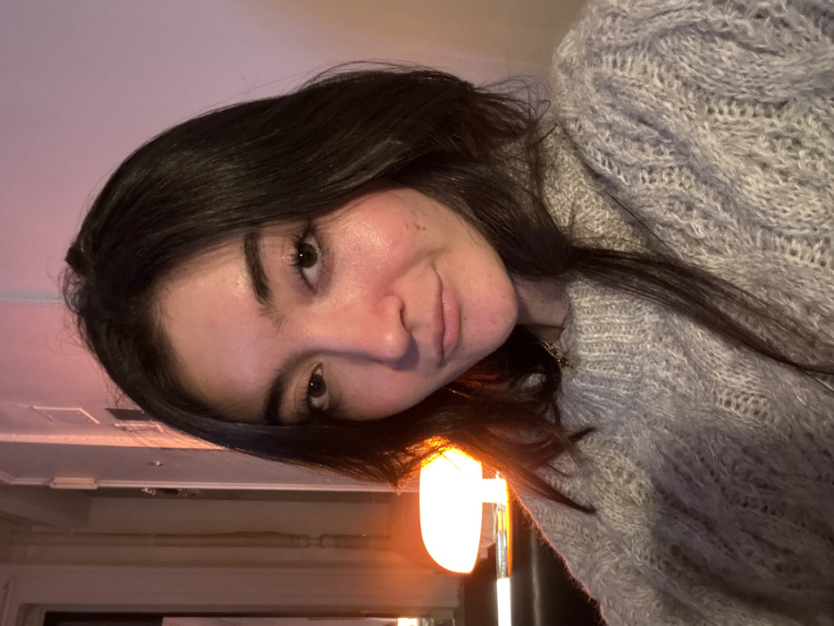 A young adult female, appearing approximately 20-30 years old, with shoulder-length dark brown hair, dark eyes, and a fair complexion, is depicted in a close-up, chest-up indoor portrait